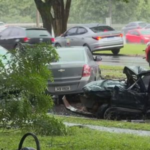 Carro é esmagado em batida tripla no Eixinho Sul; dois ficam feridos