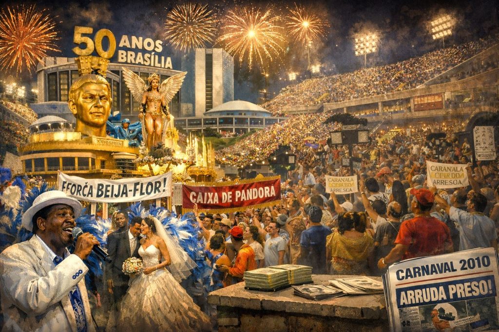 PANDORA – Apesar da comoção, em fevereiro de 2010, as atenções do público brasiliense não estavam voltadas para o tratamento do cantor, nem para as alegorias da Beija Flor. O foco era a Operação Caixa de Pandora, deflagrada três meses antes, na capital do País, e que afetaria o desempenho da escola.