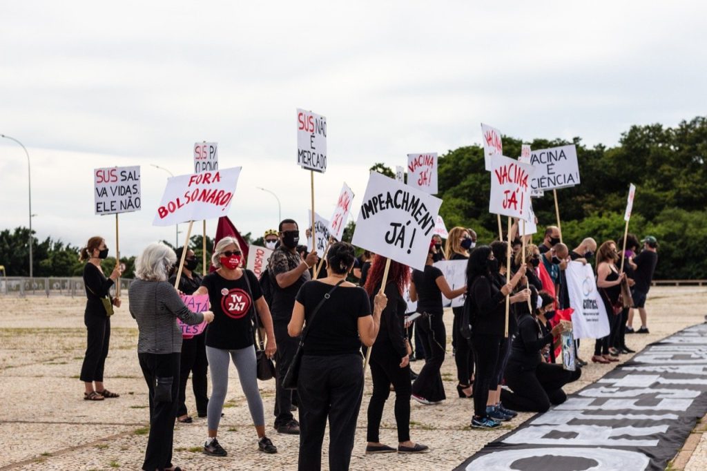 O grupo se reuniu em frente ao Palácio do Planalto portando faixas e cartazes homenageando as pessoas que perderam a vida durante a pandemia. Os manifestantes também denunciavam o sucateamento do sistema de saúde pública.