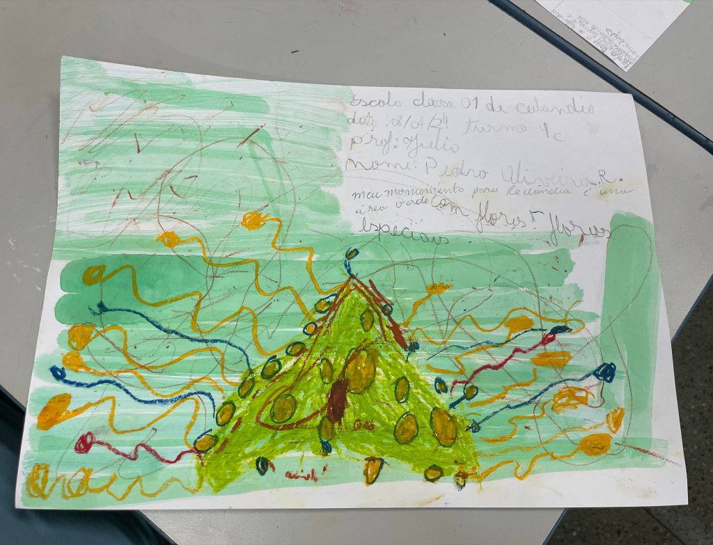 Meio-ambiente parece ser uma preocupação desses brasiliensezinhos: no Riacho Fundo, o córrego que nomeia a cidade ganhou destaque, com árvores, e sobre uma delas um homem com facão. Na Ceilândia, o menino desenhou uma árvore com “flores especiais” e justificou que a cidade precisa de áreas verdes.